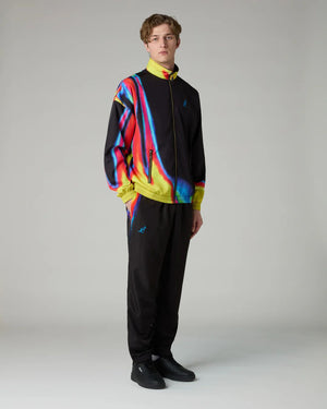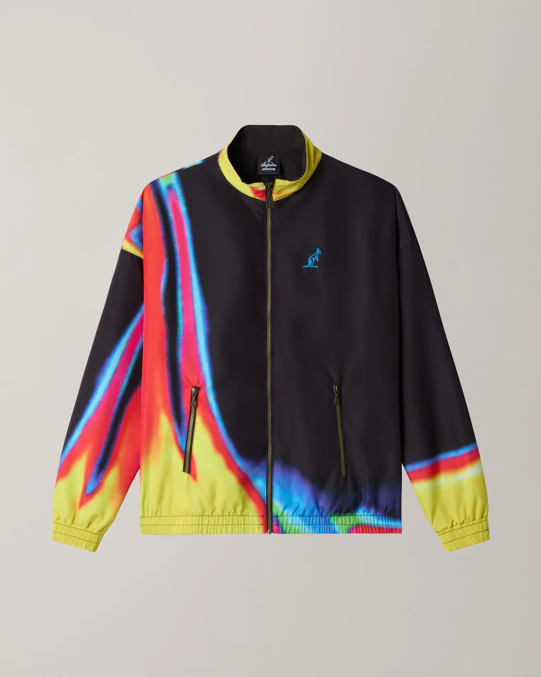 Giacca: full zip, polsini e fondo elastico, stampa multicolor effetto “heatmap” su base nera, logo canguro ricamato sul petto.